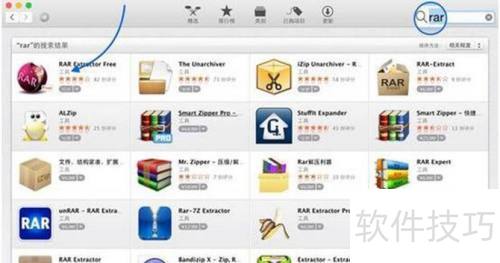 2、 在搜索框输入RAR关键字,即可找到多个在Mac上解压RAR文件的软件。这些软件有免费版也有付费版。我选择了RAR Extractor Free,大家可根据自己的喜好挑选合适的工具。