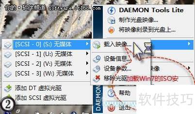 3、 首先,准备好Win7 ISO镜像文件,若无法下载,可前往首页置顶位置获取。此外,需要一款常用的虚拟光驱软件,这里选用Daemontools。右键点击Daemontools图标,依次选择虚拟设备→SCSI媒体→载入映像(2所示),将Win7安装映像加载到虚拟光驱中,以便后续安装使用。