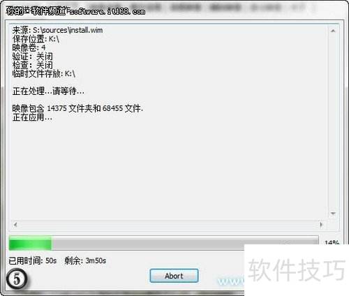 5、 选择后返回原界面,点击应用按钮,即可将Win7安装映像解压到指定盘符,所有所需文件会全部部署到目标分区。不过,操作还未完成。