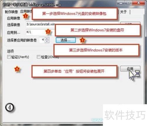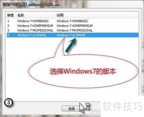 4、 接下来,打开GimageX软件。在弹出的窗口中点击应用映像选项。在选择映像旁边点击浏览,选取Win7虚拟盘符中的install.wim文件。然后点击应用到旁边的浏览,选择系统安装的目标盘符。之后,在选择要应用的映像卷旁点击选择按钮,挑选Win7的版本。这里我们使用的是旗舰版,对应第四项(3所示)。确认无误后即可继续操作。