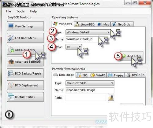 8、 在EasyBCD窗口中,点击添加新的启动项目按钮。接着,在右侧Windows选项下,将类型选择为Windows Vista/7,在名字处输入Win7,把驱动器设置为刚才安装时的盘符。点击添加项目按钮,即可成功添加新的启动项(6所示)。这样操作后,系统会识别新增的启动选项,方便后续使用。