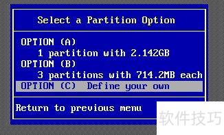 5、 这里是选择分区大小的环节,DM提供了一些自动分区选项供你挑选。若想根据个人需求自定义分区,请选择OPTION (C) Define your own。