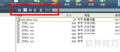 5、 在文件选择区域上方,有五个按钮用于操作所选文件,从左至右依次为上一层新建文件夹重命名删除和查看属性。路径栏展示了当前所在相对路径。按钮功能明确,用法与Windows中同名功能一致。利用这些按钮,可以对即将制作的镜像文件进行分类和整理,方便后续操作。
