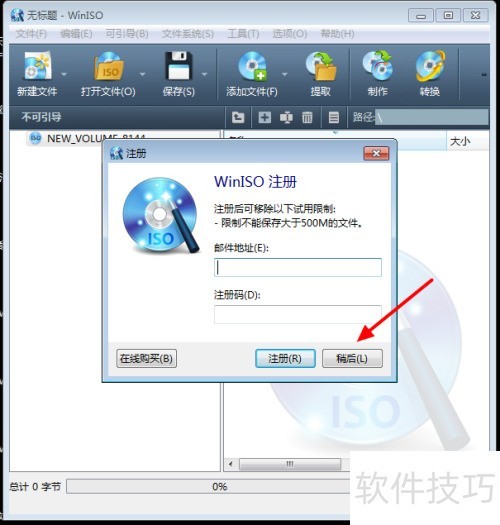2、 下载安装完成后,双击打开程序,会弹出一个询问是否注册的提示框。如果只是临时使用,可以不必注册,直接点击稍后提醒或右上角的关闭按钮即可继续使用。