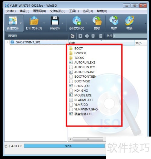 9、 点击打开后,镜像文件内容会显示在右侧框中。请注意,不要在这些文件里寻找安装执行文件,因为我们的安装方式并非如此,无需触碰标注在红框内的内容。