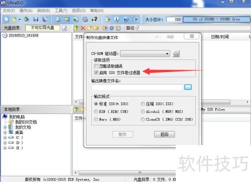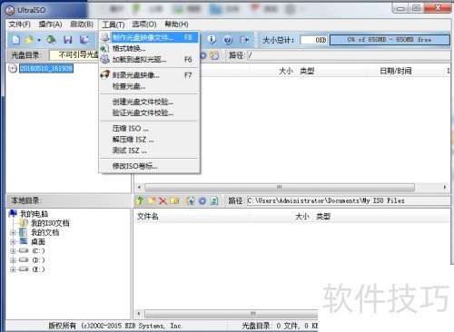 2、 在UltraISO里,点击工具菜单,然后选择制作光盘镜像文件。