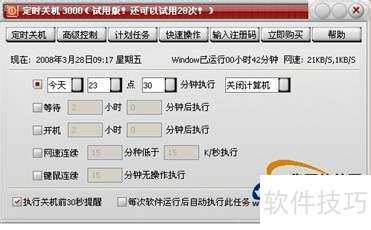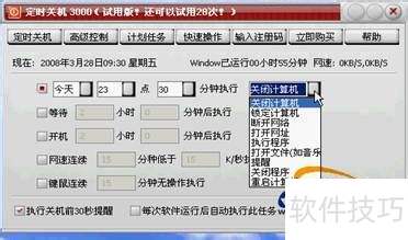 7、 在定时关机功能中,前半部分为条件设置,后半部分为对应的结果选项。这里提供了五种条件规则:一是指定当天的某个时刻关机;二是延迟特定时长后关机;三是开机达到一定时间后关机;四是当网络速度连续低于设定值时关机;五是键盘和鼠标闲置超过指定时长后关机。利用这些规则,可以实现关闭电脑、锁定系统或断开网络连接等操作。只需选择需要的操作类型与任务内容,并设置好相关参数,最后点击开始执行按钮,即可让配置生效并自动运行。