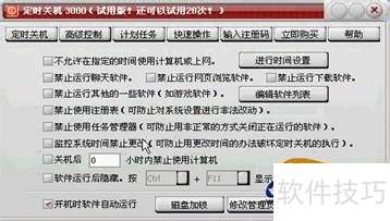 9、 高级控制具备以下功能:在你设定的时间段内,用户无法使用电脑;通过防火墙技术切断网络连接,禁止在规定时段上网;阻止使用包括QQ、UC、MSN、POPO等十余种聊天工具进行在线交流;禁止运行你指定的软件(已预设三十多款游戏程序);限制使用IE、Maxthon、TT等浏览器访问网页;防止修改系统时间(避免破坏定时关机设置);禁用任务管理器(防止非法终止运行中的程序);禁止访问注册表。此外,还可设置自动关机后多久内不允许重新启动电脑,确保管理效果。