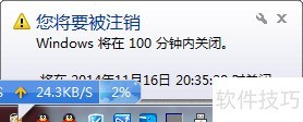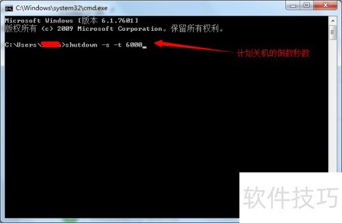 3、 在弹出的黑框中输入 shutdown -s -t XX,其中 XX 是关机倒计时时间(单位:秒)。例如,1小时后关机,将 XX 替换为 3600。Win7会于右下角显示操作成功的提示信息。