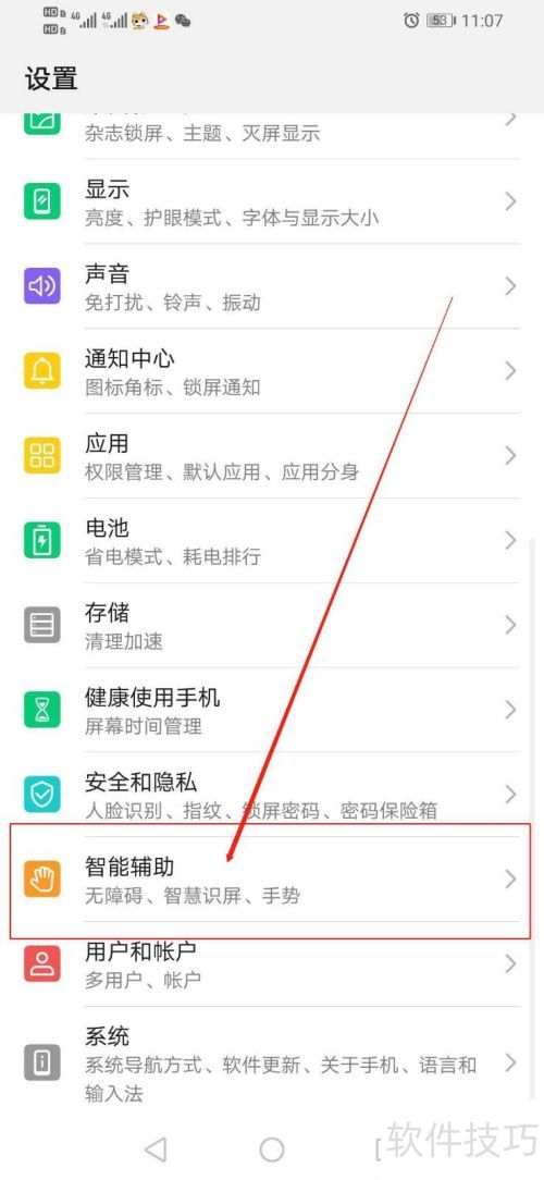3、 在设置里,向上滑动屏幕,找到智能辅助选项,所示。