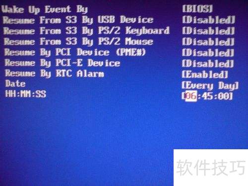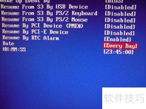8、 若需每天定时开机,可选择Every Day。比如,想设置每天6:45开机,用数字键输入06:15:00即可。完成后,通常按F10保存设置,重启电脑后生效。希望大家通过本文学会定时开机的方法。