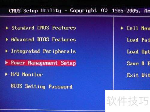 3、 要进入BIOS设置界面,看到提示图案时按下Delete键。接着利用键盘箭头键选中Power Management Setup选项,即可进入电源管理设置界面进行调整。