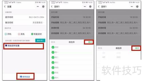 2、 点击定时设置,按需设定开关时间,设置完毕后,点击保存并发送至开关。