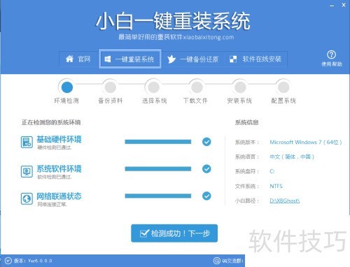 3、 软件将自动检测电脑的软硬件环境,检测通过后点击下一步。