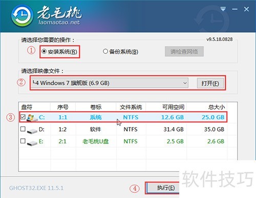 3、 进入WinPE桌面,打开一键装机软件,选择已下载的系统镜像,安装到C盘,点击执行继续操作。