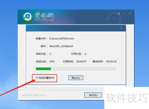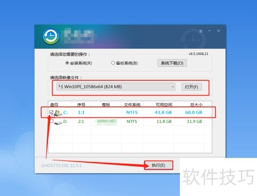 7、 进入WinPE桌面,打开一键装机工具,勾选选项,选择已下载的系统镜像,安装位置选C盘,点击执行,随后跳转至第五步操作。