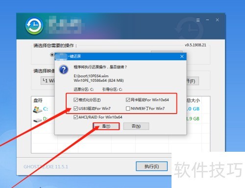 10、 出现一键还原窗口时,勾选网卡驱动和USB驱动,避免重装后网络或鼠标异常,然后点击是继续操作。