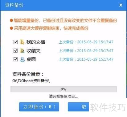 3、 系统盘(通常是C盘)里的重要资料需要备份,系统论坛一键重装支持备份我的文档、收藏夹及桌面文件。若不想备份,可不勾选相关选项。下方进度条会显示备份进度与文件数量,完成后即可进行下一步操作。