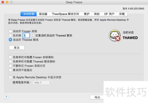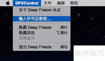 7、 登录冰点精灵后,mac左上角会出现DFXControl选项。请将鼠标置于冰点界面再点击,否则该选项不会显示。确保操作准确以正常使用功能。