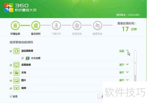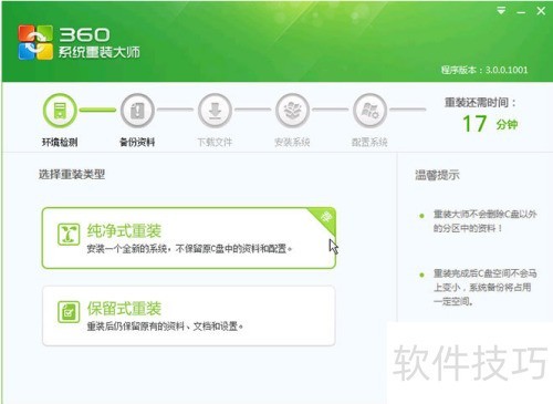 3、 选择纯净式重装会立即开始系统重装;选择保留式重装则会进入资料选择页面,您可挑选需要保留的数据。当前支持备份的内容涵盖:QQ、MSN、旺旺、YY语音等聊天记录,以及我的文档、桌面文件、Outlook邮件、IE和360浏览器收藏夹等重要个人数据。若数据不在支持备份范围内,请您手动备份至非系统盘(C盘)的其他分区,以免丢失。