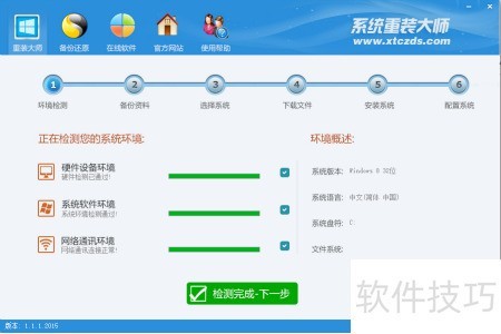 2、 第二步,软件将自动检测电脑的软硬件环境和网络连通状态,检测完成后点击下一步按钮继续操作。