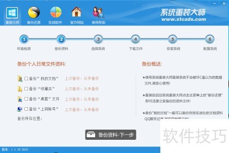 6、 接下来为大家介绍系统重装大师的备份还原功能。其核心在于数据的备份与恢复:在软件使用时,可将重要数据备份至系统重装大师文件夹。为简化操作,用户开启软件后,选择顶部的一键备份还原按钮,即可进入相关界面。左侧橙色区域提供备份与还原选项。备份完成后,若重装系统,可通过一键还原功能,将原先C盘中的数据恢复到对应目录及桌面位置,确保资料安全无忧。