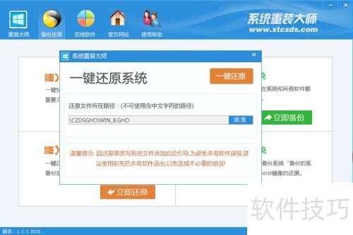 7、 另一个一键还原系统功能,可通过点击浏览按钮进入本地文件夹,选择备份的系统文件或czdsghot目录下系统重装大师备份的系统Ghost文件进行一键还原安装。有了这些功能,用户都能轻松操作系统!