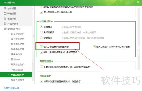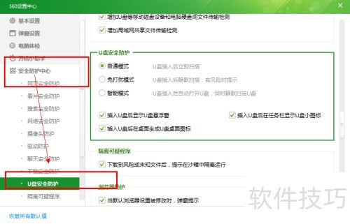 3、 点击左侧安全防护中心,然后选择U盘防护功能。