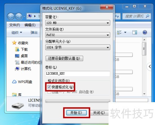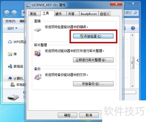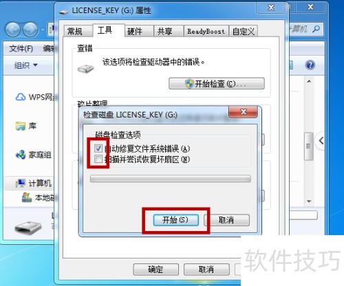 4、 检查U盘时,先勾选自动修复文件系统错误与扫描并尝试恢复坏扇区,然后点击开始。