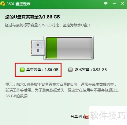 15、 用360U盘鉴定器检测U盘标称容量与实际容量是否一致。