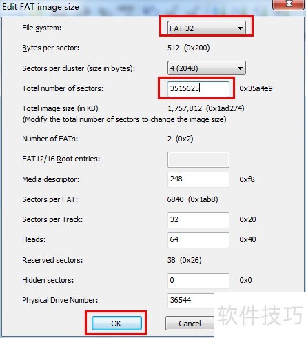 5、 Total Number of Sectors的设置方法如下:1.86G大于1.8G,等于1.8乘以1000的三次方。因此,Total Number of Sectors应设为1.8G除以512b,结果为3515625。同时,FileSystem需设置为Fat32。点击确定按钮,将该配置保存为镜像文件以供使用。这样可以确保数据存储容量与文件系统的兼容性符合要求。