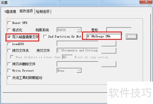 11、 解压工具后运行主程序,程序将自动识别U盘信息。在主界面点击设定按钮,切换至修改选项卡,勾选定入镜像文件,再选择已制作好的镜像文件即可。