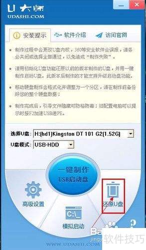 3、 点击软件界面的还原U盘按钮,会弹窗提示备份重要数据。备份完成后,单击确定继续,所示。