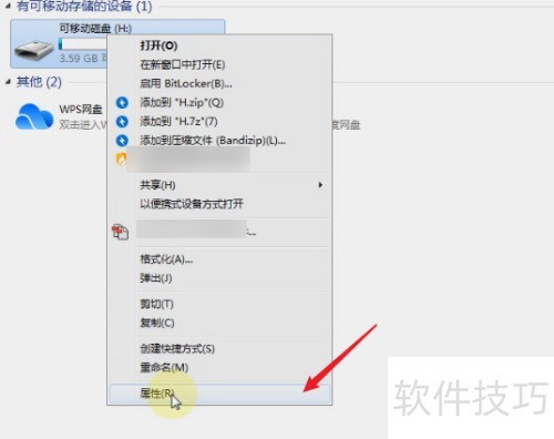 2、 返回盘符,右击U盘盘符,在菜单中选择属性。
