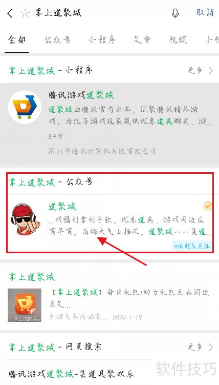 8、 在搜索框输入聚城,找到并进入其公众号。