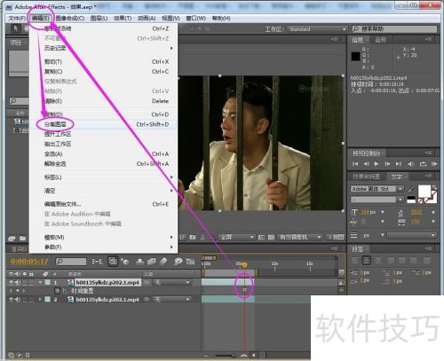 2、 复制视频素材图层,设置冻结帧效果。操作步骤:选择菜单命令。