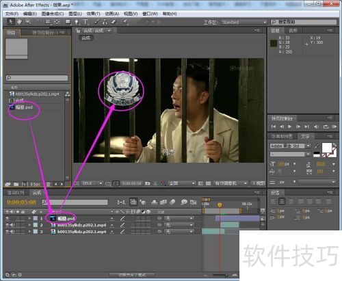 5、 将抠像完成的帽徽素材PSD文件导入时间线中。