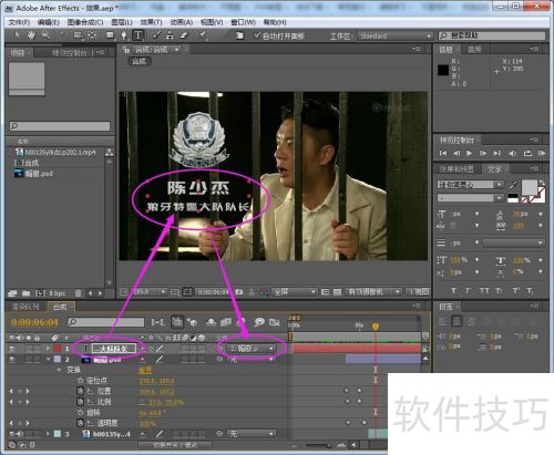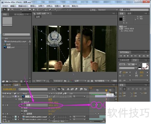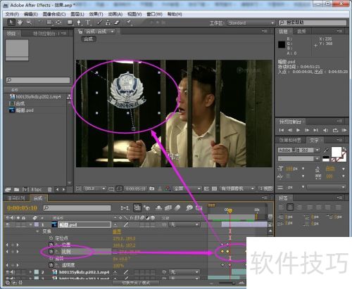 8、 为徽标图层设置关键帧比例,添加辅助飞入飞出的变形动画效果。