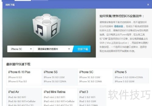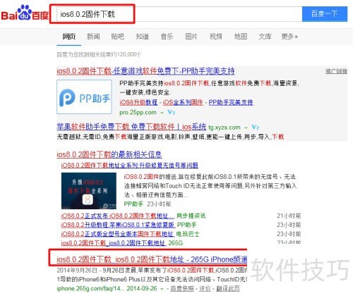 5、 通过iTunes升级的方法:首先,我们需要获取苹果设备适用的iOS 8.0.2固件。大家可以前往百度,搜索iOS 8.0.2固件下载,从而找到固件的下载链接。完成下载后,即可使用iTunes进行升级操作。