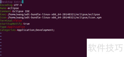 3、 在该文件夹中创建一个eclipse快捷方式。使用root权限编辑eclipse.desktop文件(sudo vim eclipse.desktop),否则无法保存。