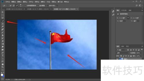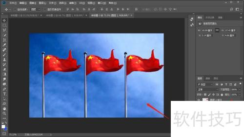 在PS中,怎样把图片里的一面白旗变成三面红旗?