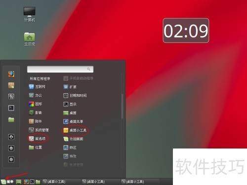 2、 有两种方法启动该设置:一是点击左下角菜单,依次选择首选项和桌面小工具;二是直接右键桌面,选择桌面小工具。