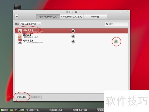 3、 添加桌面小工具很简单:进入小工具界面,点击所需工具,再点击左下角的添加到桌面按钮。添加后,小工具会显示在桌面上,设置中的绿色按钮表示已成功添加。