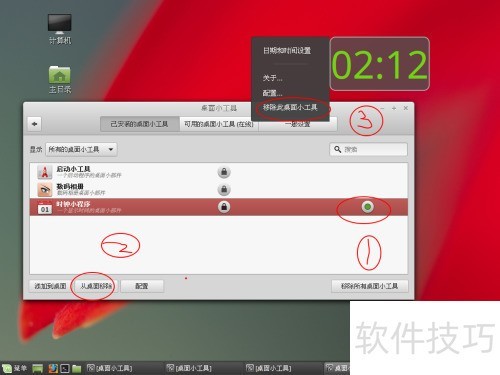 4、 要移除小工具,可在设置中点击右侧绿色按钮选择要移除的工具,再点左下角的移除按钮;或者直接在桌面小工具上右键选择移除。