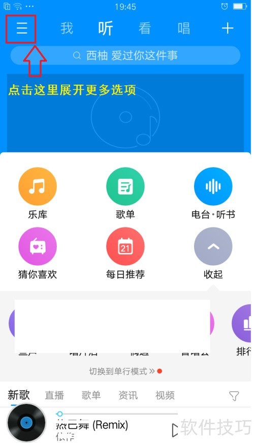 3、 随后,在展开的菜单里选择听歌识曲,进入界面后再次点击该选项。