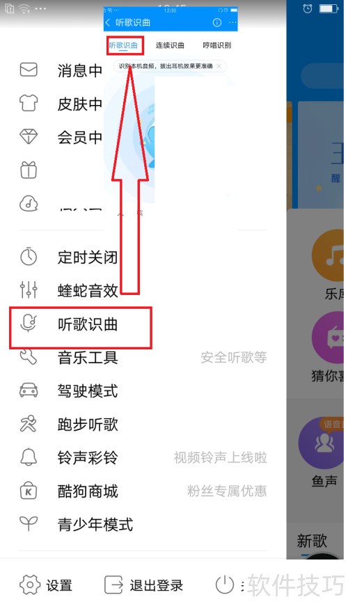 8、 打开酷狗音乐,点击左上角菜单按钮,选择听歌识曲功能,即可使用。