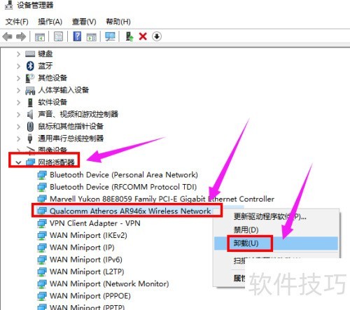 6、 右击无线网卡,选择卸载,即可移除驱动程序。