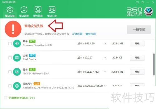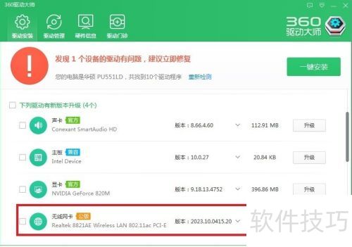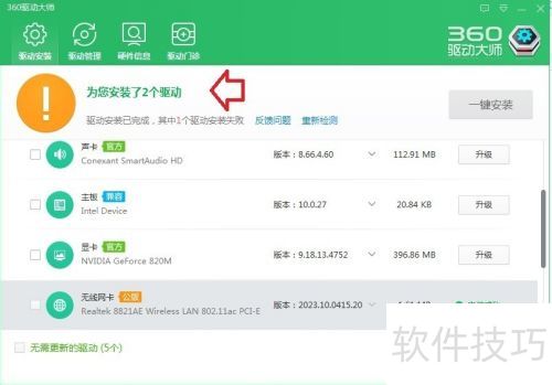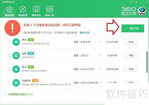 7、 若不清楚,扫描后点击一键安装,即可解决所有已列出设备的驱动问题。