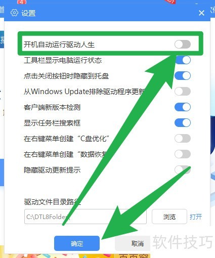 3、 关闭开机自动运行驱动人生,点击确定即可完成设置。