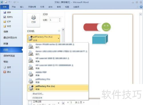 5、 打开一个有内容的文档,选中后点击打印选项。选择打印机时,请务必挑选pdfFactory Pro虚拟打印机,否则无法转换为PDF格式。设置好合适的纸张尺寸,最后点击确认或打印即可完成操作。